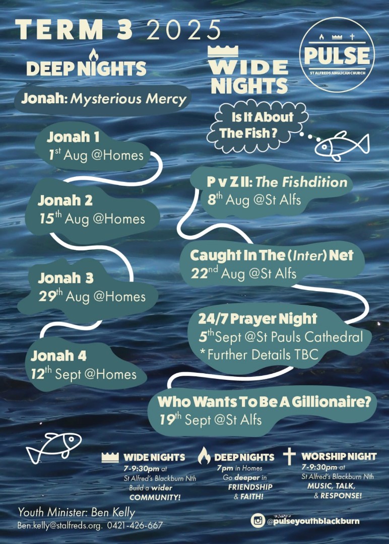 Pulse is a group of young people who are passionate about knowing Jesus and making him known. We meet regularly to grow in faith, build community and have fun! Pulse is run by Ben Kelly, our Youth Minister. All leaders of this program have a Working With Children check and have completed all safe ministry requirements. You can read our Safe Ministry Policy by clicking the button at the top of this page .